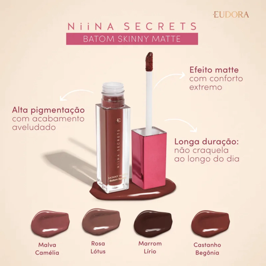 O Batom Líquido Eudora Niina Secrets Skinny Matte une elegância e conforto em uma única fórmula. Desenvolvido especialmente para lábios que necessitam de cor duradoura sem ressecamento, o produto valoriza naturalmente qualquer tom de pele.
